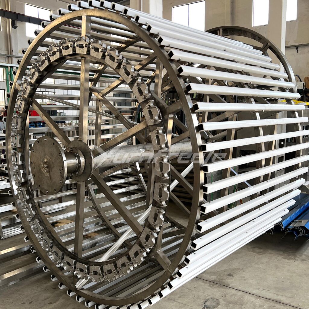 Stainless steel drum with UHMW-PE covering reduces wear and increases durability.